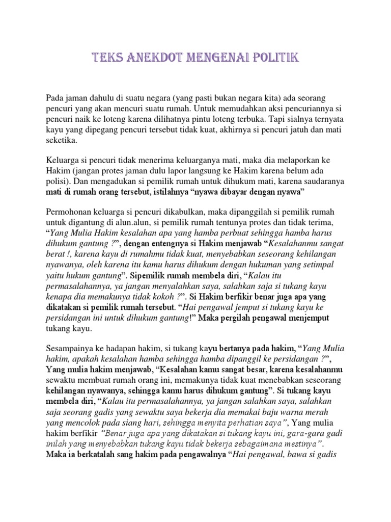 Hal yang paling sangat merumitkannya yaitu bagaimana lembaganya selalu tidak bisa menyelesaikan permasalahan yang terdapat di dalam negeri ini. Pak kepala nampak sangat kebingungan yang tengah menghadapi beragam masalah yang bergejolak di negeri ini. Teks anekdot singkat tentang politik dalam bahasa indonesia anekdot adalah sebuah teks cerita singkat yang menarik serta lucu.